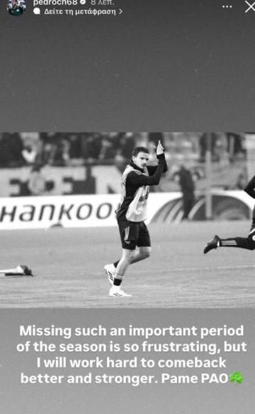 Σε ανάρτησή του στο Instagram, ο Ισπανός μέσος έγραψε: «Το να χάνεις μια τόσο σημαντική περίοδο της σεζόν είναι τόσο εκνευριστικό, αλλά θα δουλέψω σκληρά για να επιστρέψω καλύτερος και πιο δυνατός. Πάμε ΠΑΟ».