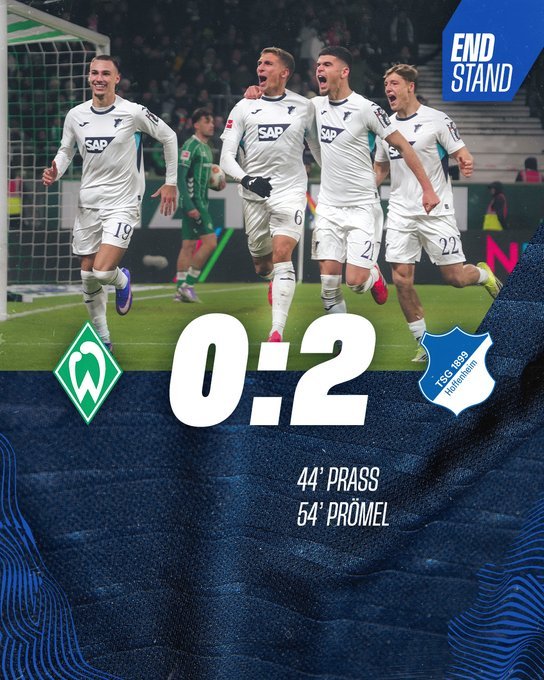 Συνεχίζει τις υψηλές πτήσεις της η Χοφενχάιμ, η οποία πέρασε με 2-0 από την έδρα της Βέρντερ, έφτασε τις τέσσερις σερί νίκες κι έχει σταθεροποιηθεί στην τριάδα. Σε μπελάδες η ομάδα της Βρέμης, που βρίσκεται στην 15η θέση και μόλις τρεις πόντους από τη θέση των μπαράζ.