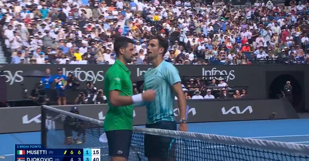 Μετά από 2 ώρες και 8 λεπτά παιχνιδιού, ο Λορέντζο Μουζέτι εγκατέλειψε τον αγώνα, λόγω τραυματισμού, με τον Νόβακ Τζόκοβιτς να παίρνει την πρόκριση για τα ημιτελικά του Αυστραλιανού Όπεν.