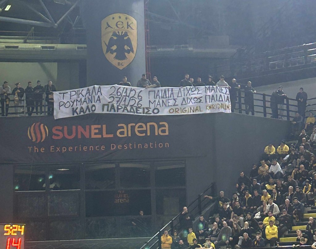 Ένα πανό για τις τραγωδίες στα Τρίκαλα, με την έκρηξη στο εργοαστάσιο, και τη Ρουμανία, με το πολύνεκρο δυστύχημα, έχει ανέβει στη SUNEL Arena από την Original Κορυδαλλού. «Τρίκαλα 26/1/26: Παιδιά δίχως μάνες. Ρουμανία 27/1/26: Μάνες δίχως παιδιά. Καλό Παράδεισο» αναφέρει το πανό.