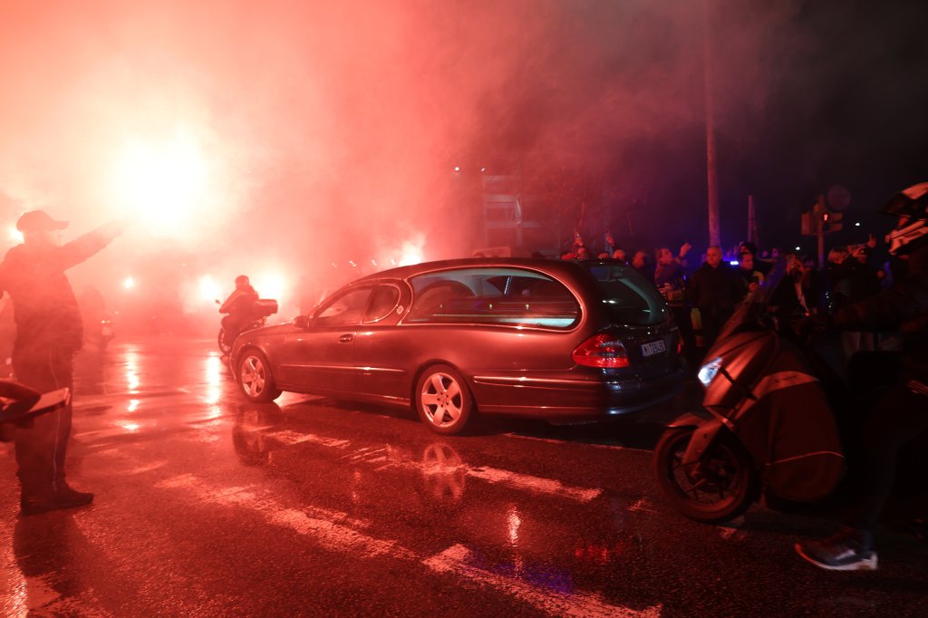 Οι οπαδοί του ΠΑΟΚ με πομπή που ξεκίνησε από το γήπεδο της Τούμπας, κατευθύνθηκαν προς το αεροδρόμιο «Μακεδονία» κι από εκεί επέστρεψαν στο γήπεδο, μαζί με τις σωρούς των εφτά αδικοχαμένων παιδιών.