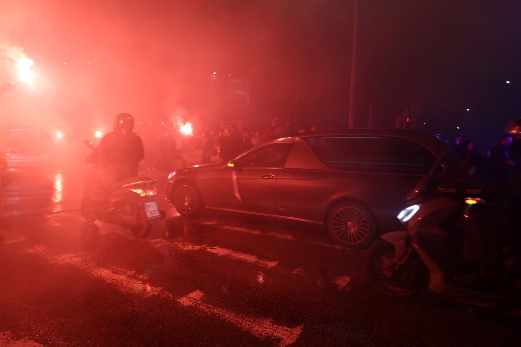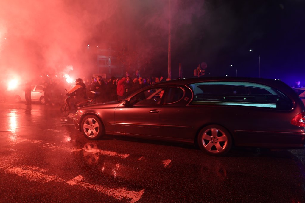 Όπως είχε ανακοινωθεί από την Τετάρτη, η ασπρόμαυρη πομπή συνόδευσε μέχρι το γήπεδο, τις σωρούς των εφτά εκλιπόντων, μετά την επιστροφή των σωρών από τη Ρουμανία, όπου σημειώθηκε το τραγικό δυστύχημα, το μεσημέρι της Τρίτης.