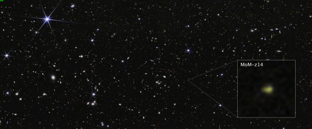 Χρησιμοποιώντας το όργανο NIRSpec (Φασματογράφος Εγγύς Υπέρυθρου) του James Webb, οι αστρονόμοι επιβεβαίωσαν ότι το φως του γαλαξία MoM-z14 ταξιδεύει μέσα στον διαστελλόμενο χώρο, επιμηκυνόμενο και «μετατοπιζόμενο» προς μεγαλύτερα, πιο ερυθρά μήκη κύματος, για περίπου 13,5 από τα εκτιμώμενα 13,8 δισεκατομμύρια χρόνια ύπαρξης του Σύμπαντος.