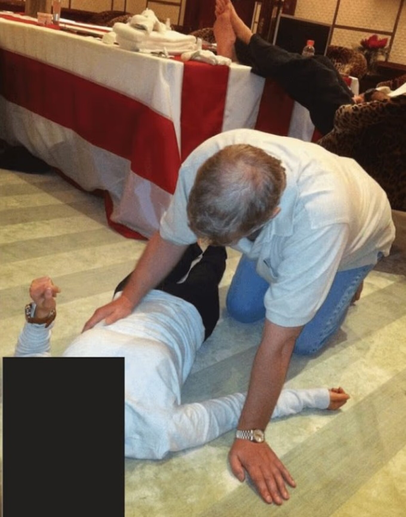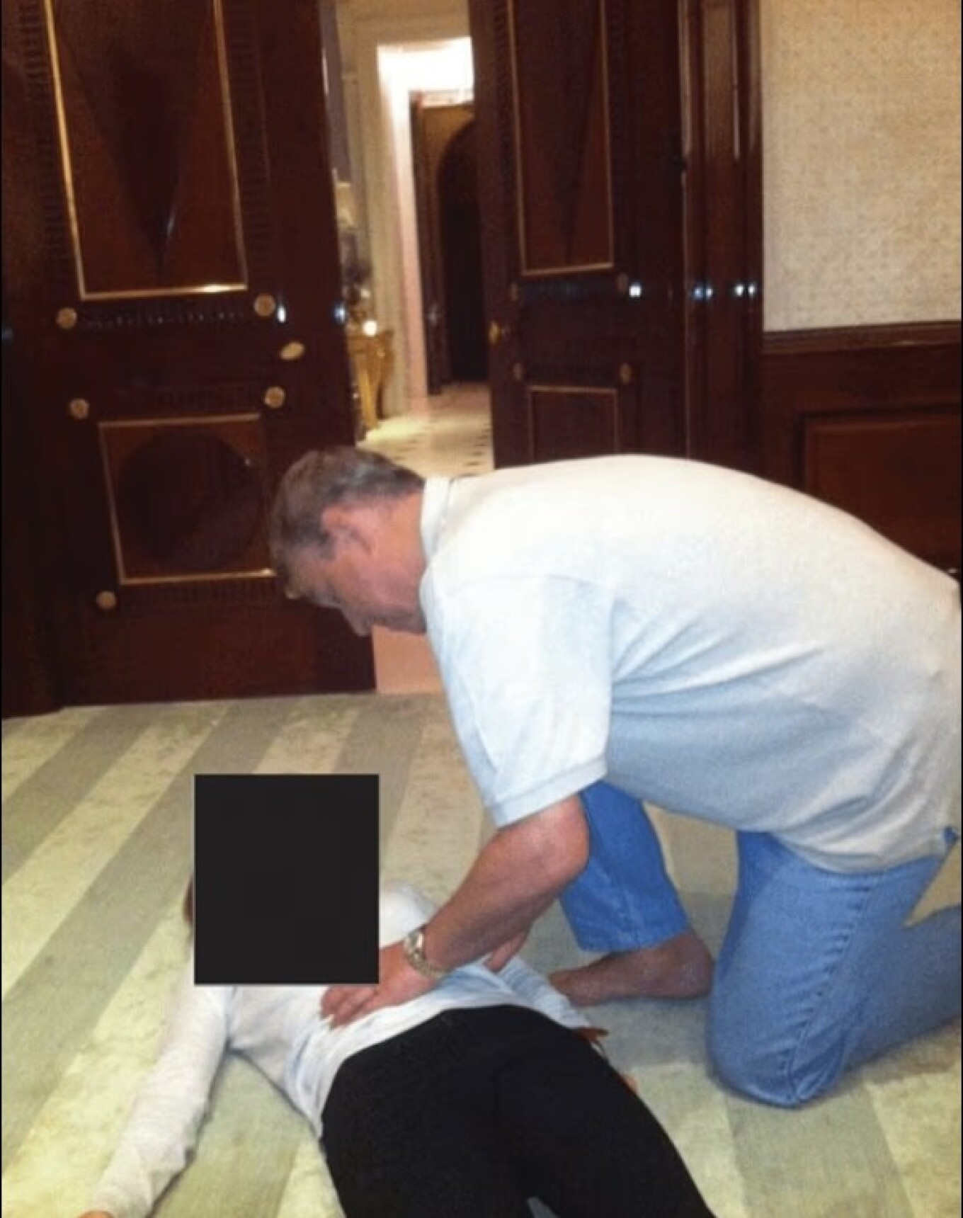 Στις τρεις εικόνες, άνδρας που φέρεται να είναι ο πρώην πρίγκιπας εμφανίζεται σκυμμένος πάνω από το άτομο που είναι ξαπλωμένο ανάσκελα, με τα χέρια απλωμένα