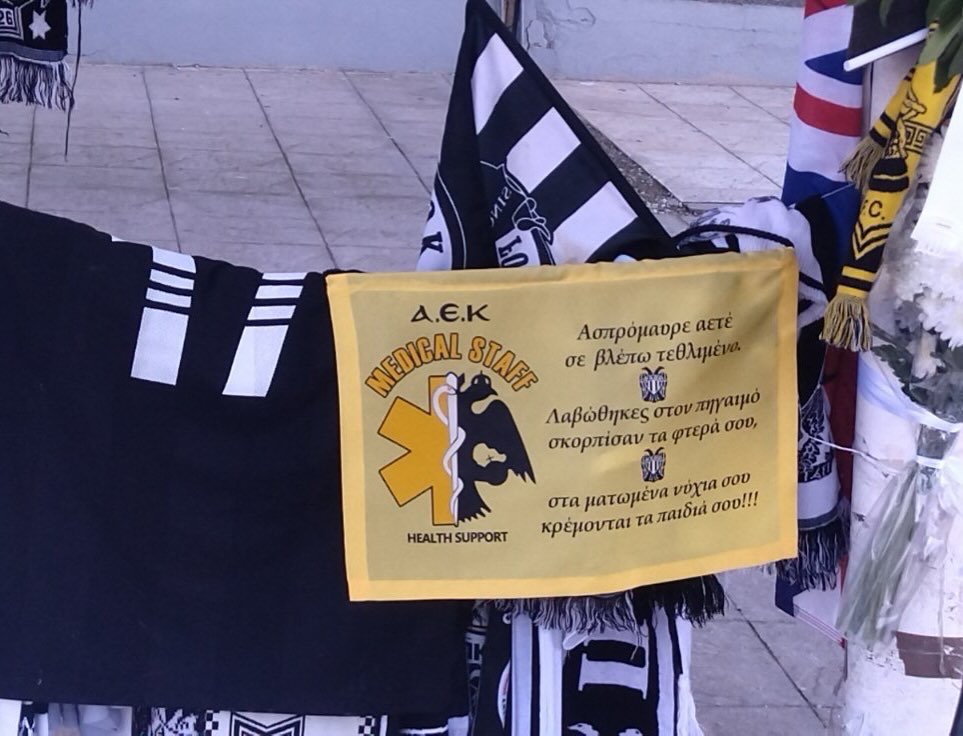 Λουλούδια και ένα συμβολικό λάβαρο κατατέθηκαν σιωπηλά, ως ένδειξη τιμής και διαρκούς μνήμης. Οπως έγραψαν οι Εθελοντές Διασώστες της ΑΕΚ: "