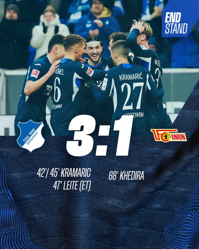 Στη δεύτερη θέση, ισόβαθμη της Μπορούσια Ντόρτμουντ, σκαρφάλωσε η Χόφενχαϊμ, φτάνοντας τις πέντε συνεχόμενες νίκες, μετά και το 3-1 επί της Ουνιόν Βερολίνου. Με πρωταγωνιστή τον Αντρέι Κράμαριτς, έφτασε τις επτά σερί, εντός έδρας, νίκες, επίδοση που αποτελεί ρεκόρ για την ομάδα του Κρίστιαν Ίλζερ.