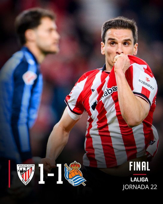 Σε ένα πραγματικό ντέρμπι στο "Σαν Μαμές", Αθλέτικ Μπιλμπάο και Ρεάλ Σοσιεδάδ αναδείχθηκαν ισόπαλες 1-1. Αποβολή στο 82’ για την ομάδα του Ματαράτσο, γκολ-ισοφάρισης στο 88’ για εκείνη του Βαλβέρδε. Έκτο σερί ματς που μένουν αήττητοι οι «γαλανόλευκοι», παραμένουν χωρίς νίκη μέσα στο 2026 οι «ερυθρόλευκοι».