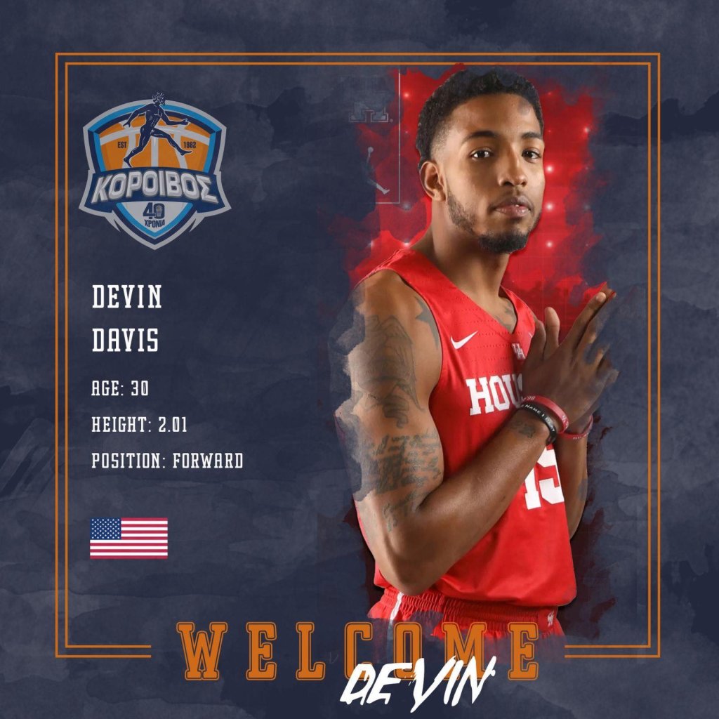 -Ο Α.Σ.Α. Κόροιβος ανακοινώνει την απόκτηση του Devin Davis, Αμερικανού forward ύψους 2.01 μ., γεννημένου στις 29 Μαρτίου 1995 στην Indianapolis των ΗΠΑ, ενός αθλητή με σημαντική εμπειρία σε Ευρώπη και Αμερική και σταθερή παρουσία σε υψηλό επίπεδο.