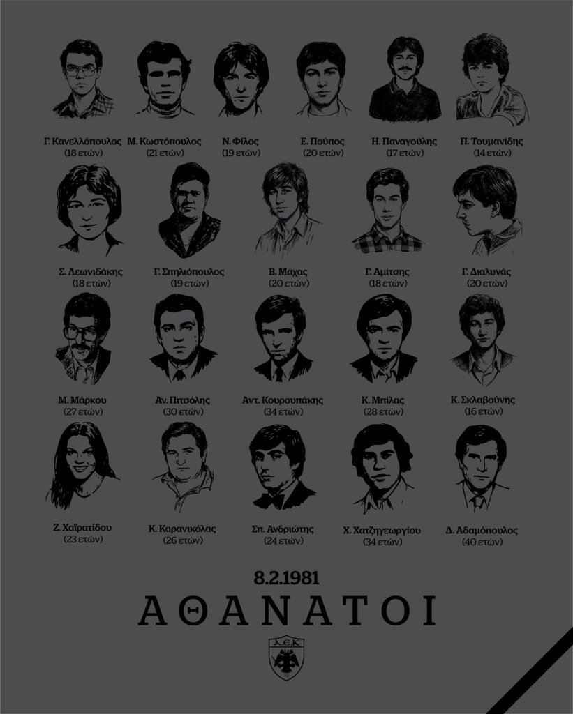Η Οικογένεια της ΑΕΚ τιμά και σήμερα τη μνήμη των 20 νέων ανθρώπων, φιλάθλων του Ολυμπιακού και ενός της ΑΕΚ, που έχασαν άδικα τη ζωή τους στις 8 Φεβρουαρίου του 1981, ευρισκόμενοι ως θεατές απλά στο γήπεδο δίπλα στις αγαπημένες τους ομάδες. Χρέος όλων μας απέναντι σε αυτά τα παιδιά που χάθηκαν, είναι να δίνουμε πάντα προτεραιότητα στο θέμα της ασφάλειας των φιλάθλων, η οποία πρέπει να είναι αδιαπραγμάτευτη. Κάθε χρόνο 8 Φλεβάρη όλη η φίλαθλη Ελλάδα θα τιμά τη Μνήμη των 21 αυτών Νέων παιδιών...