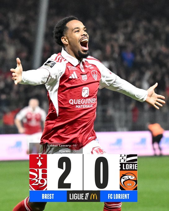 Η Μπρεστ επικράτησε 2-0 της Λοριάν και απομακρύνθηκε από τη ζώνη του υποβιβασμού. Στο 50’ ο Λασκαρί έδωσε το προβάδισμα στη Μπρεστ και στο 77’ ο Αζόρκ διαμόρφωσε το τελικό σκορ.