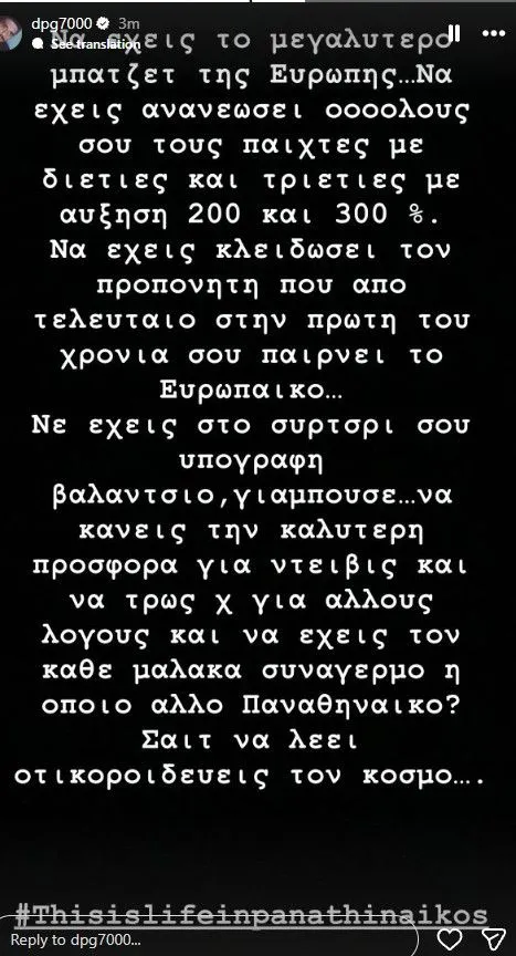 "Είσαι το μεγαλύτερο μπάτζετ της Ευρώπης… Να έχεις ανανεώσει όλους σου τους παίκτες με διετείς και τριετείς με αύξηση 200 και 300%. Να έχεις κλειδώσει τον προπονητή που από τελευταίο στην πρώτη του χρονιά σου παίρνει το Ευρωπαϊκό… Να έχεις στο συρτάρι σου υπογραφή Βαλαντσιούνας, Γιαμπουσέ… Να κάνεις την καλύτερη προσφορά για Ντέιβις και να τρως Χ για άλλους λόγους και να έχεις τον κάθε μαλάκα συναγερμό ή όποιο άλλο Παναθηναϊκό site να λέει ότι κοροϊδεύεις τον κόσμο".