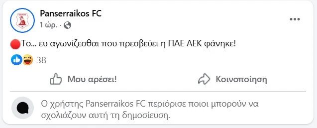Συγκεκριμένα, η ομάδα των Σερρών ανάρτησε: «Το... ευ αγωνίζεσθαι που πρεσβεύει η ΠΑΕ ΑΕΚ φάνηκε!».