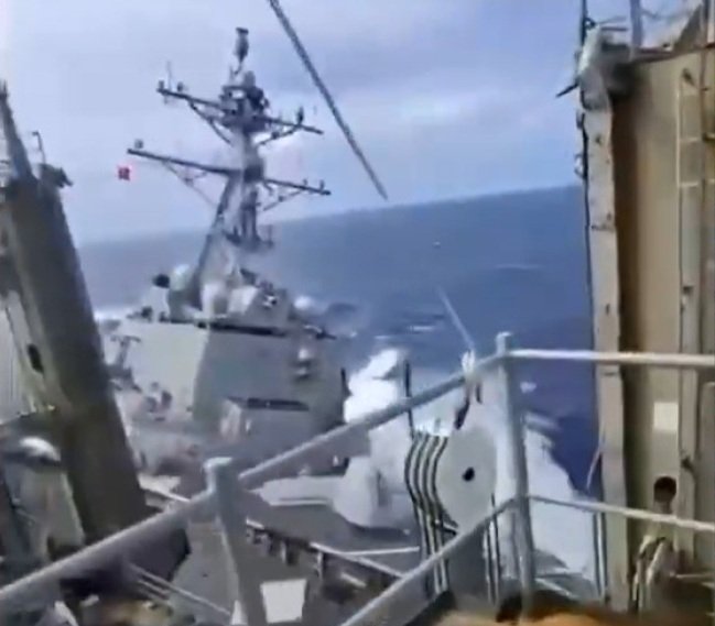 Πρόκειται για ένα πολεμικό πλοίο του αμερικανικού ναυτικού και για ένα πλοίο ανεφοδιασμού του ναυτικού, τα οποια συγκρούστηκαν κατά τη διάρκεια μιας επιχείρησης ανεφοδιασμού.