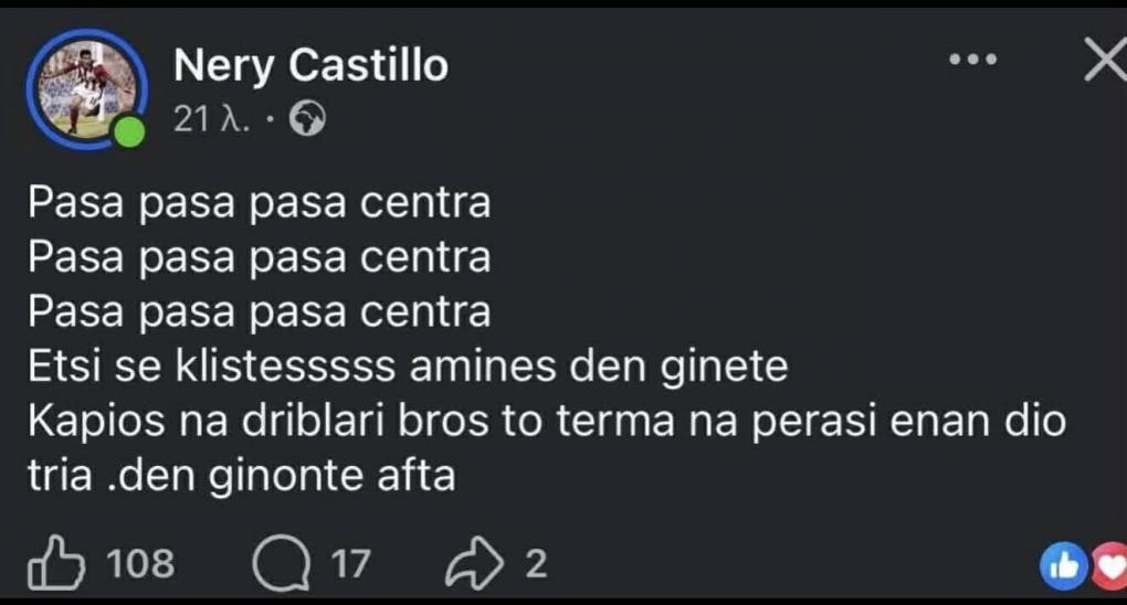 Ο τρόπος παιχνιδιού του Ολυμπιακού εξόργισε τον Νέρι Καστίγιο. Σε ανάρτησή του, ο Μεξικανός παλαίμαχος άσος της ομάδας έγραψε: "Πάσα πάσα πάσα σέντρα