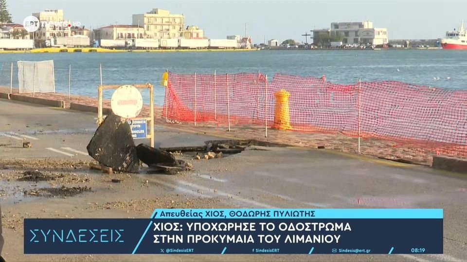 Η εικόνα από το λιμάνι της Χίου με το οδόστρωμα να έχει υποχωρήσει σε τμήμα του λιμανιού.