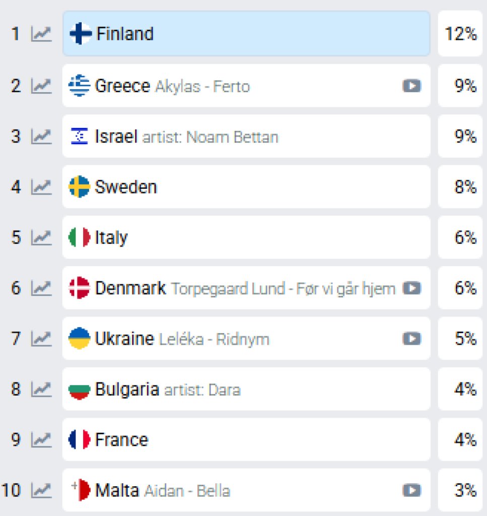Πριν από ένα μήνα, πριν ακόμα ανακοινωθεί πως ο 27χρονος τραγουδιστής θα εκπροσωπήσει τη χώρα στον μουσικό διαγωνισμό, τα στοιχήματα έδειχναν πως η Ελλάδα βρισκόταν ήδη στην τρίτη θέση. Μόλις όμως έγινε επίσημο πως ο Akylas είναι ο νικητής του Sing for Greece 2026, η χώρα ανέβηκε μία θέση και πλέον βρίσκεται στη δεύτερη.