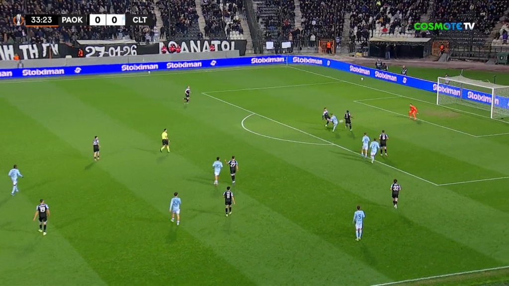 Τακουνάκι του Ρόμαν στον κενό χώρο και ο Άσπας με ψύχραιμο πλασέ εκτελεί τον Τσιφτσή για το 0-1 στο 34'