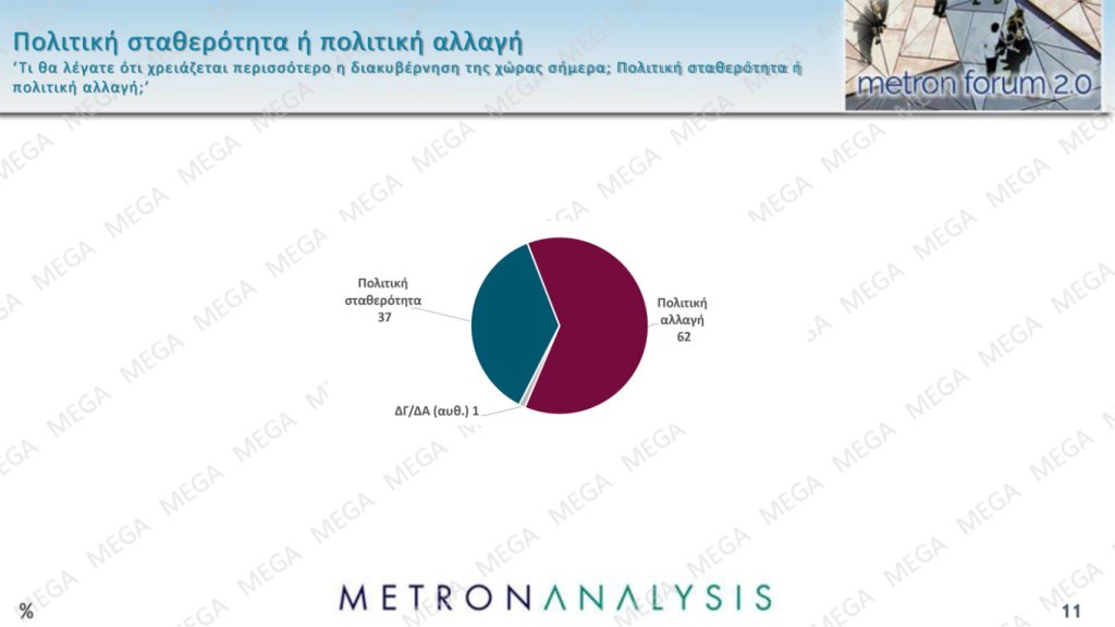 Οριακές είναι οι μεταβολές στο ερώτημα αν η διακυβέρνηση της χώρας χρειάζεται περισσότερο την πολιτική σταθερότητα ή την πολιτική αλλαγή: Αυτόν τον μήνα, η πολιτική σταθερότητα (37%) χάνει μία μονάδα υπέρ της πολιτικής αλλαγής (62%).