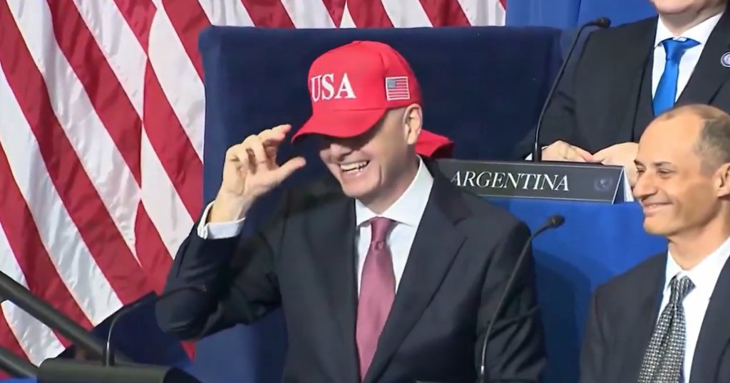 Συγκεκριμένα, ο πρόεδρος της FIFA φορούσε καπέλο του Ντόναλντ Τραμπ με USA και τα νούμερα "45" και "47", που συμβολίζουν ότι είναι ο 45ος και 47ος πρόεδρος των ΗΠΑ.