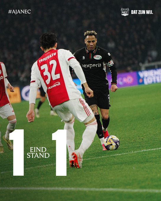 Με τον βαθμό της ισοπαλίας έφυγε η Ναϊμέχεν από την έδρα του Άγιαξ(1-1) και έχει τον πρώτο λόγο για την κατάληξη της 3ης θέσης και την έξοδο στο Champions League! Στο 39’ ο «Αίαντας» πήρε κεφάλι στο σκορ με τον Γκοντς, με τον Νέγιασμιτς στο 57’ να διαμορφώνει το τελικό σκορ.