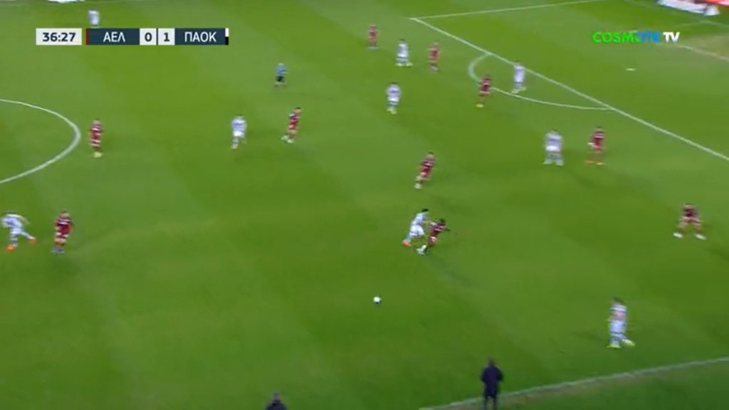 Ευκαιρία για τον ΠΑΟΚ, με τον Γιακουμάκη να γίνεται αποδέκτης της μπάλας έξω από την περιοχή, με το στατικό του σουτ να περνά ελάχιστα δίπλα από το αριστερό δοκάρι της ΑΕΛ.