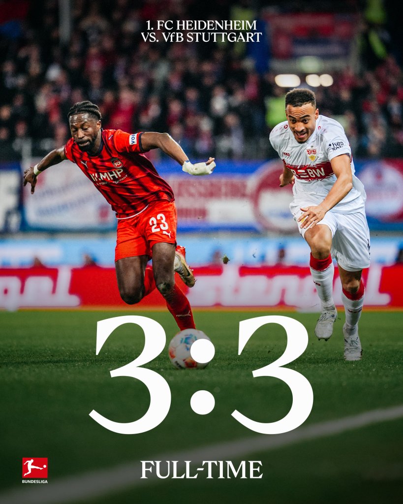 Η Στουτγάρδη βρέθηκε δυο φορές πίσω στο σκορ, στην έδρα της ουραγού Χάιντενχαϊμ, και, το μόνο που κατάφερε, ήταν να σώσει τον βαθμό, στο χορταστικό 3-3. Αποτέλεσμα, ωστόσο, που της στέρησε τη δυνατότητα να μειώσει στον ένα βαθμό την απόσταση από τη τρίτη θέση.