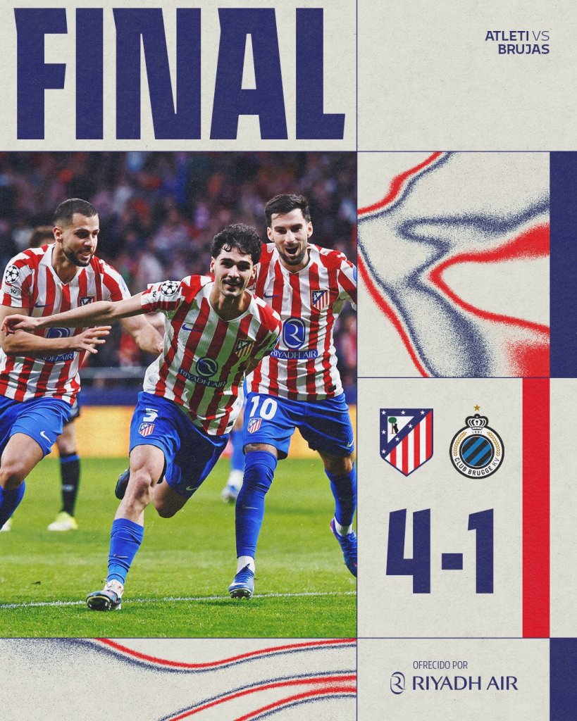 Η Ατλέτικο λύγισε την Μπριζ με 4-1 και σε συνδυασμό με το 3-3 του πρώτου αγώνα, πήρε την πρόκριση για τη φάση των «16». Λίβερπουλ ή Τότεναμ η επόμενη αντίπαλος των «ροχιμπλάνκος».