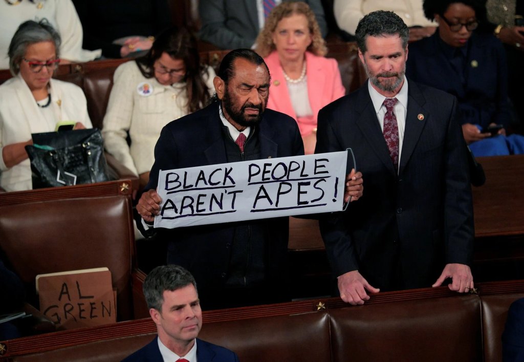 Ο βετεράνος αφροαμερικανός δημοκρατικός βουλευτής Αλ Γκριν, ο οποίος αντιπροσωπεύει το Τέξας, άνοιξε πλακάτ στο οποίο αναγραφόταν η φράση «οι μαύροι δεν είναι πίθηκοι» προτού αποβληθεί από την αίθουσα, καθώς ο ρεπουμπλικάνος πρόεδρος Ντόναλντ Τραμπ άρχιζε την ομιλία του για την «κατάσταση της ένωσης» ενώπιον της ολομέλειας και των δυο σωμάτων του Κογκρέσου.