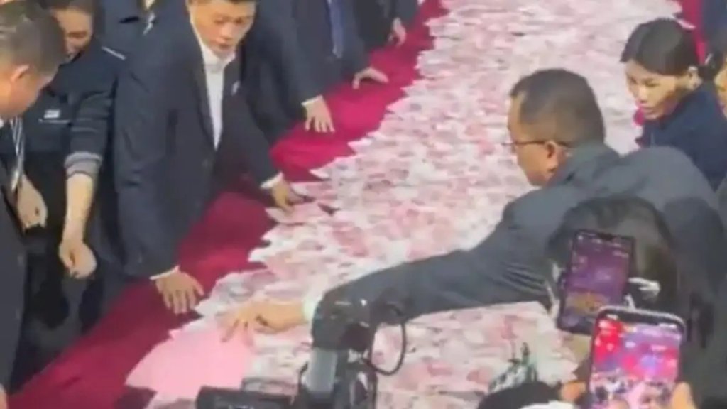 During a Chinese New Year celebration, Henan Kuangshan Crane piled up mountains of cash for 7,000 employees.
