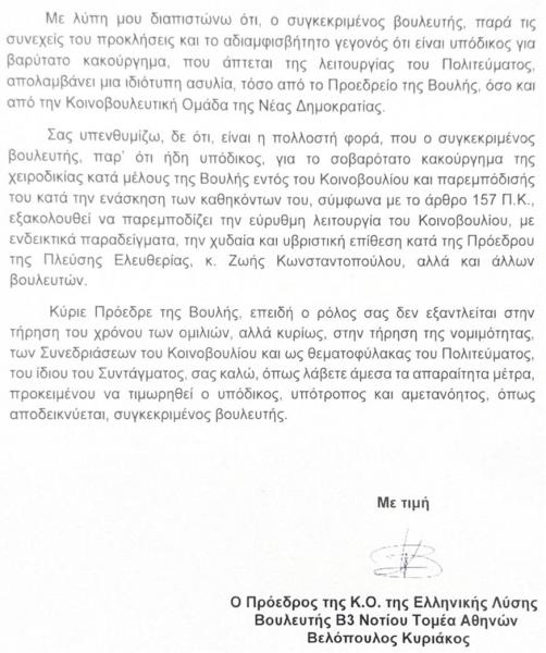 Μεταξύ άλλων, ο πρόεδρος της Ελληνικής Λύσης στην επιστολή του προς τον Νικήτα Κακλαμάνη σημειώνει πως «με λύπη μου διαπιστώνω ότι ο συγκεκριμένος βουλευτής, παρά τις συνεχείς του προκλήσεις και το αδιαμφισβήτητο γεγονός ότι είναι υπόδικος για βαρύτατο κακούργημα, που άπτεται της λειτουργίας του Πολιτεύματος, απολαμβάνει μια ιδιότυπη ασυλία, τόσο από το προεδρείο της Βουλής, όσο και από την Κοινοβουλευτική Ομάδα της Νέας Δημοκρατίας», καλώντας, παράλληλα, τον πρόεδρο της Βουλής να λάβει άμεσα τα απαραίτητα μέτρα, ώστε «να τιμωρηθεί ο υπόδικος, υπότροπος και αμετανόητος βουλευτής».