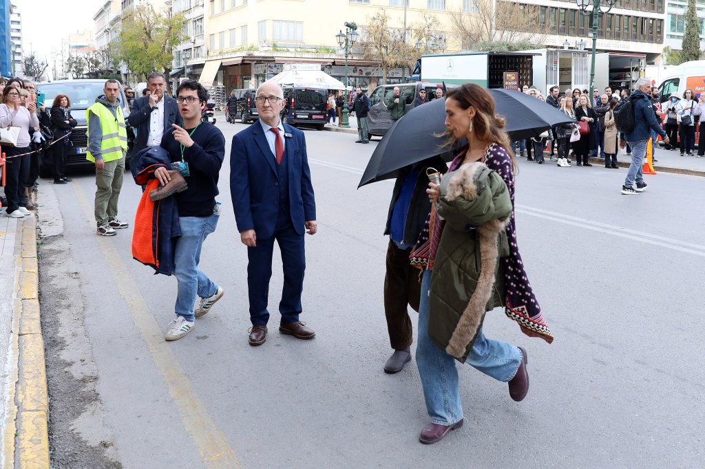 Οι υπάλληλοι του δήμου Αθηναίων είχαν συγκεντρωθεί στην πόρτα για να δουν τον ηθοποιό και ο δήμαρχος Χάρης Δούκας... ζήλεψε: «θέλω κάθε πρωί να με περιμένετε κι εμένα έτσι» είπε γελώντας.