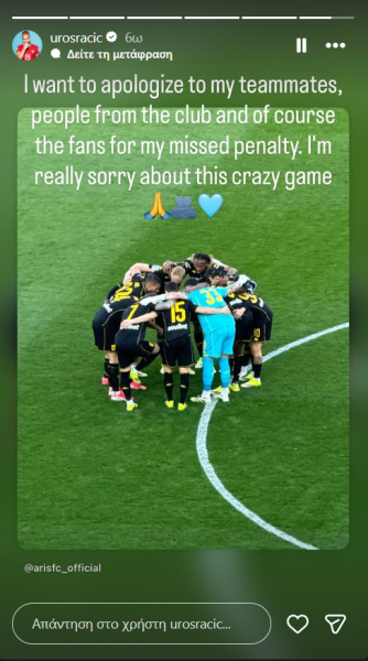 Συγκεκριμένα, έγραψε το εξής: "Θέλω να απολογηθώ στους συμπαίκτες μου, τους ανθρώπους της ομάδας και φυσικά τον κόσμο για το χαμένο πέναλτι. Ζητάω ειλικρινά συγγνώμη για αυτόν τον 'τρελό' αγώνα".