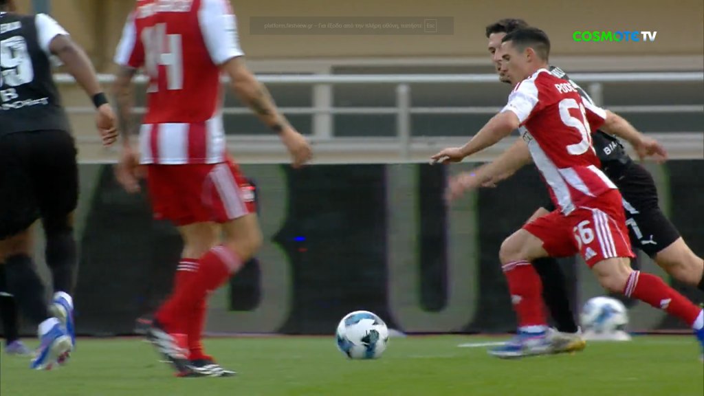 Ευκαιρία για τον Ολυμπιακό, με τον Ποντένσε να έρχεται στα δεξιά και να συγκλίνει, σουτάροντας λίγο δίπλα από το αριστερό δοκάρι του Χριστογεώργου.