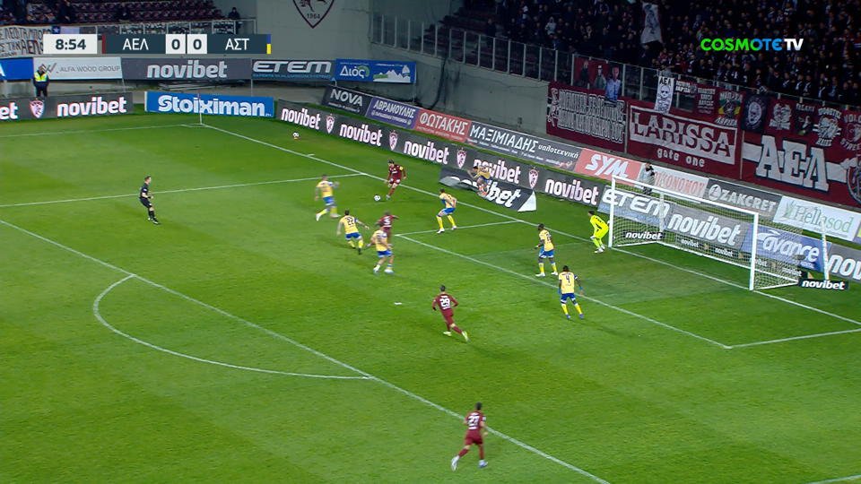 Ο Σαγκάλ σττο 9’ έκανε φοβερή ενέργεια και γύρισμα από αριστερά, η μπάλα βρήκε στον Τριανταφυλλόπουλο και σταμάτησε στο δοκάρι.