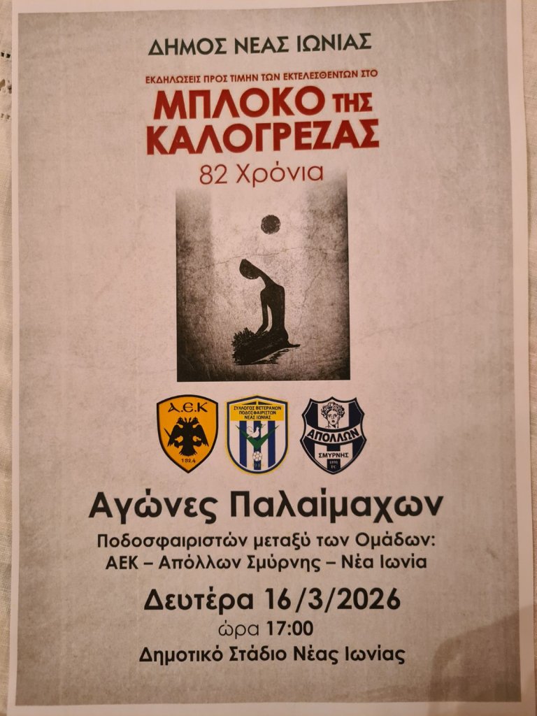 Εκατό δύο χρόνια μετά τη δημιουργία της και 82 χρόνια μετά το μπλόκο στην Καλογρέζα, η Νέα Ιωνία, τιμάει αύριο, 16 Μαρτίου 2026, με ένα σπουδαίο ποδοσφαιρικό τουρνουά βετεράνων, τη μνήμη των 22 εκτελεσθέντων από τους Γερμανούς στις 15 Μαρτίου 1944 στο Μπλόκο της προσφυγομάνας περιοχής. Στο τουρνουά, εκτός από τους γηπεδούχους διοργανωτές, θα συμμετέχουν οι ομάδες βετεράνων ποδοσφαιριστών της ΑΕΚ, όπως το κάνει σχεδόν από καθιερώσεως του θεσμού, αλλά και οι βετεράνοι του Απόλλων Σμύρνης
