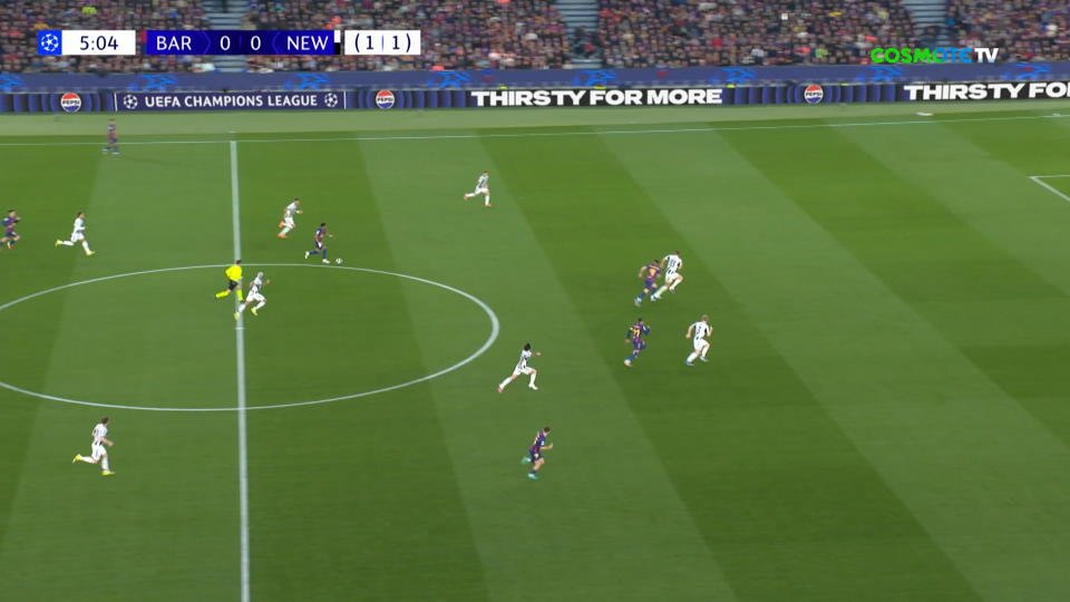 Ο Γιαμάλ έδωσε κάθετα στον Ραφίνια ,εκείνος άλλαξε με τον Φερμίν και με διαγώνιο σουτ από δεξιά έκανε το 1-0.