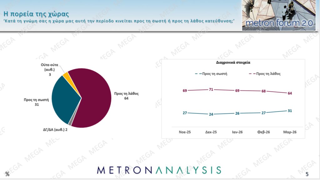 Παράλληλα, ο «δείκτης απαισιοδοξίας» κινήθηκε χαμηλότερα κατά 4 μονάδες: πλέον, το 31%( από 27% τον Φεβρουάριο) δηλώνει ότι η Ελλάδα κινείται σε σωστή κατεύθυνση και το 64% (από 68%) σε λάθος κατεύθυνση. Ενδιαφέρον έχει ότι το 72% λέει ότι η επίθεση εναντίον του Ιράν δεν είναι δικαιολογημένη και μόλις το 24% την χαρακτηρίζει «δικαιολογημένη».