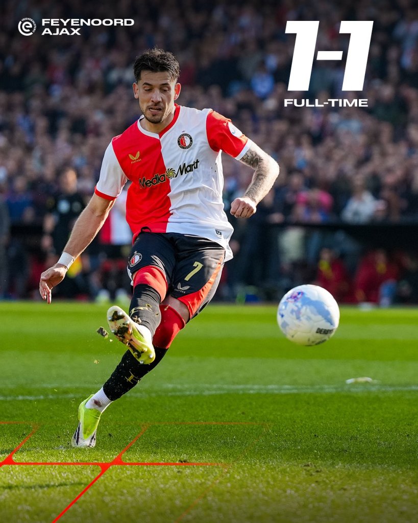 Η Φέγενορντ των έντεκα απουσιών βρέθηκε πίσω στο σκορ, στο Klassikier, όμως, κατάφερε να ισοφαρίσει τον Άγιαξ, 1-1, και να παραμείνει στη δεύτερη θέση, που οδηγεί στη League Phase του Champions League. Τεράστια χαμένη ευκαιρία για την ομάδα του Άμστερνταμ, η οποία, πλέον, βρίσκεται στο -5 από τη Φέγενορντ, έξι αγωνιστικές πριν το φινάλε.