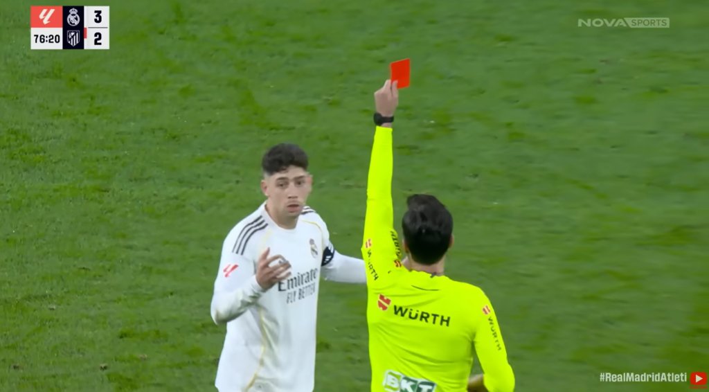 Στο 77ο λεπτό του μαδριλένικου ντέρμπι, η Ρεάλ έμεινε με δέκα παίκτες, όταν ο Φεντερίκο Βαλβέρδε αντίκρισε, απευθείας, κόκκινη κάρτα, για δυνατό μαρκάρισμα στον Μπαένα.