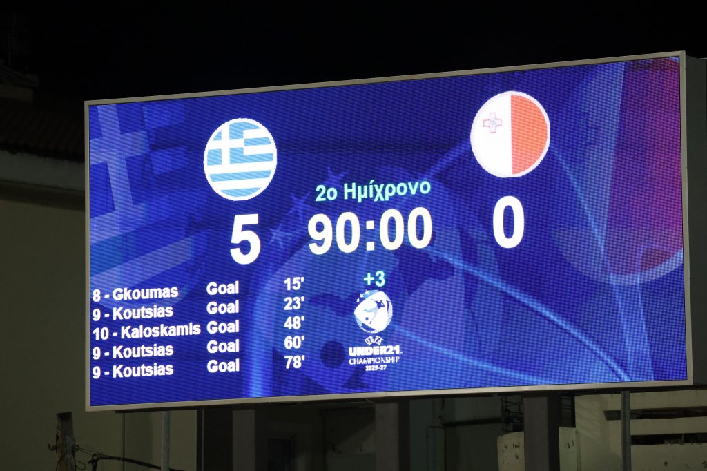 «Παράσταση» για ένα... ρόλο στη Λιβαδειά. Η U21 της Ελλάδας συνέτριψε την αντίστοιχη ομάδα της Μάλτας με 5-0 και έκανε το 6Χ6 στον 6ο προκριματικό του Euro U21 του 2027. Πρωταγωνιστής ο Κούτσιας με «τέλειο» χατ τρικ (κεφαλιά, δεξί και αριστερό πόδι).