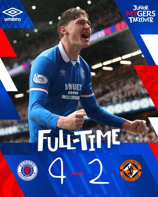 Η Ρέιντζερς κέρδισε με 4-2 την Νταντί Γιουνάιτεντ κι έπιασε τη Χαρτς στην κορυφή, με τις «καρδιές» να έχουν ένα ματς λιγότερο.