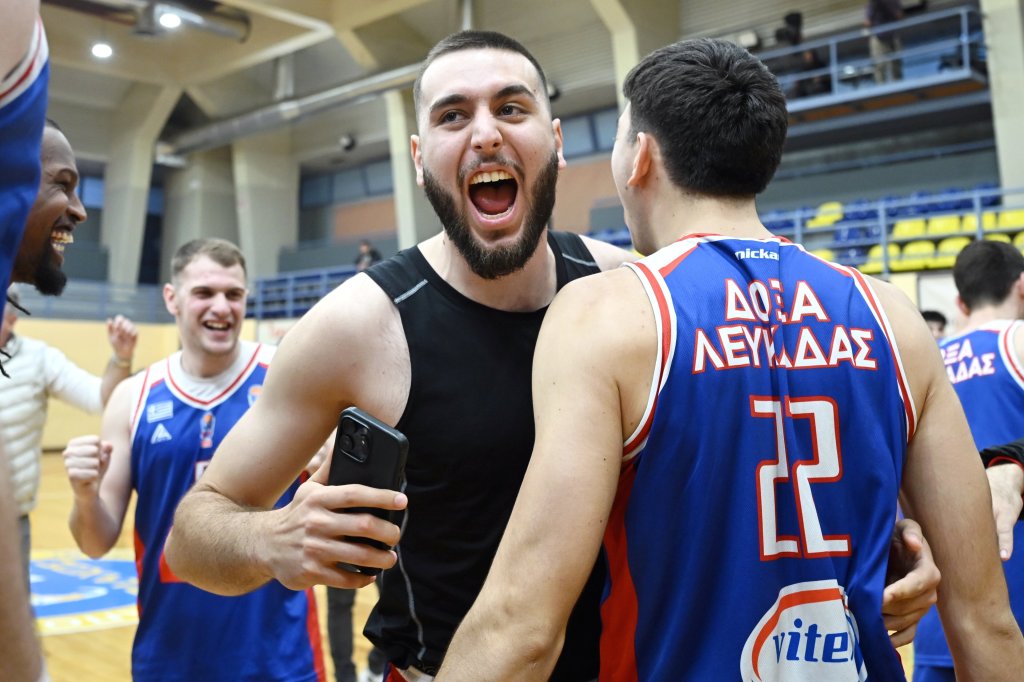 Η Δόξα Λευκάδας πανηγυρίζει την απευθείας άνοδό της στη GBL μετά τη νίκη της (54-65) απέναντι στη Δάφνη για την 30η αγωνιστική της Elite League.