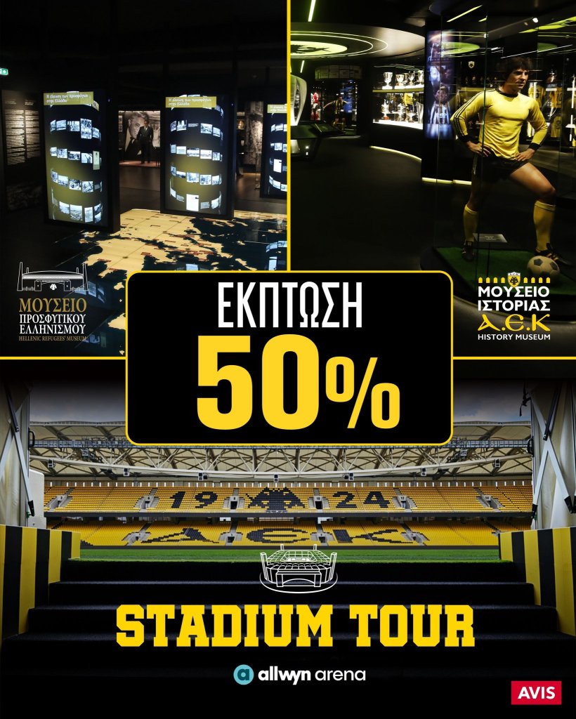 Από τη Διεύθυνση των Μουσείων Ιστορίας της ΑΕΚ και Προσφυγικού Ελληνισμού στην ALLWYN Arena γίνεται γνωστό ότι από τη Μεγάλη Τρίτη 7 Απριλίου 2026 έως την Κυριακή 19 Απριλίου 2026 θα ισχύσει έκπτωση 50% σε όλα τα κανονικά εισιτήρια των Μουσείων και της ξενάγησης του γηπέδου.