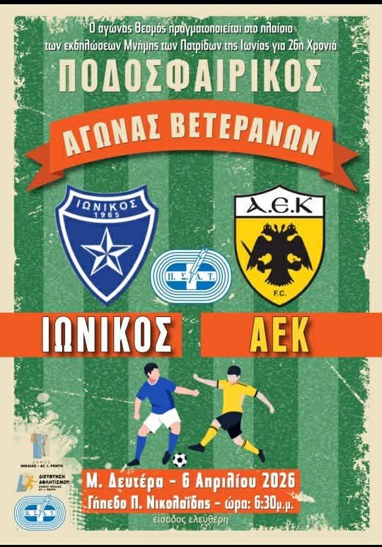 Είστε όλοι προσκεκλημένοι στον Αγώνα Θεσμό για τη μνήμη των Πατρίδων της Ιωνίας την Παγκόσμια Ημέρα Αθλητισμού για την Ειρήνη, μεταξύ των Βετεράνων Ποδοσφαιριστών του ΙΩΝΙΚΟΥ ΝΙΚΑΙΑΣ και της ΑΕΚ.