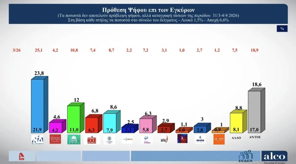 Πιο αναλυτικά, στην πρόθεση ψήφου τα κόμματα λαμβάνουν τα εξής ποσοστά: