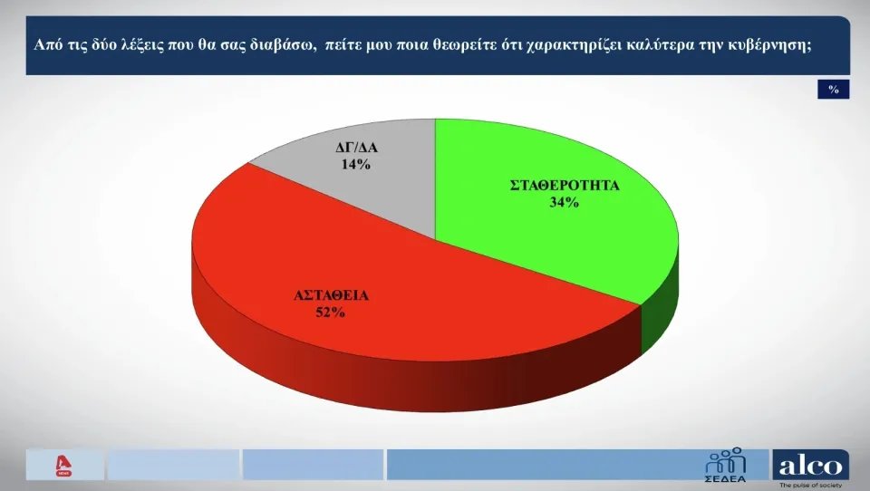 Η λέξη «αστάθεια» είναι αυτή που χαρακτηρίζει την κυβέρνηση σε ποσοστό 52% ενώ το 34% - ποσοστό σαφώς υψηλότερο από την εικόνα της ΝΔ στην πρόθεση ψήφου - απαντά πως η «σταθερότητα» χαρακτηρίζει την κυβέρνηση.