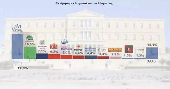 Πρώτη (33%) με διαφορά 17 μονάδων από το δεύτερο ΠΑΣΟΚ είναι η Νέα Δημοκρατία στην εκτίμηση ψήφου.