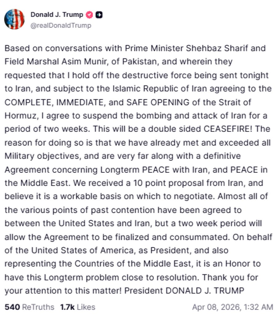 «Με βάση τις συνομιλίες με τον Πρωθυπουργό Σεχμπάζ Σαρίφ και τον στρατάρχη Ασίμ Μουνίρ του Πακιστάν, και κατόπιν αιτήματός τους να αναστείλω τη καταστροφική ισχύ που επρόκειτο να αποσταλεί απόψε στο Ιράν, και υπό την προϋπόθεση ότι η Ισλαμική Δημοκρατία του Ιράν θα συμφωνήσει στο ΠΛΗΡΕΣ, ΑΜΕΣΟ και ΑΣΦΑΛΕΣ άνοιγμα των Στενών του Ορμούζ, συμφωνώ να αναστείλω τον βομβαρδισμό και την επίθεση κατά του Ιράν για περίοδο δύο εβδομάδων», ανέφερε χαρακτηριστικά.