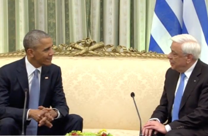 Οι δυο άντρες βρέθηκαν στο σαλόνι του Μεγάρου και η πρώτη ερώτηση του Ομπάμα στον Παυλόπουλο ήταν αν το προεδρικό Μέγαρο είναι η κατοικία του! Ο Παυλόπουλος απάντησε χαμογελώντας ότι μένει αλλού.