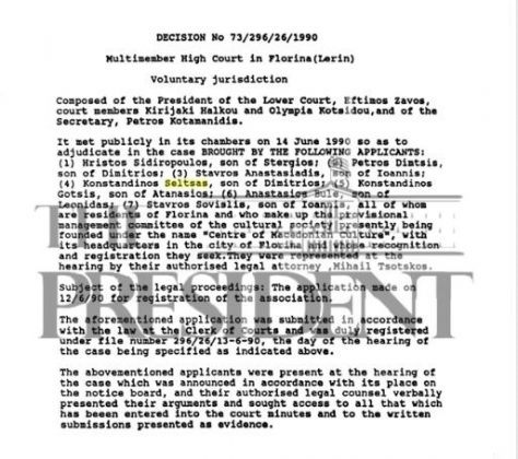 Σύμφωνα με την έκθεση του HELSINKI WATCH «Denying Ethnic Identity: The Macedonians of Greece» (έκδοση 1994)», ο Κωνσταντίνος Σέλτσας του Δημητρίου, το 1990, προσέφυγε στο Πρωτοδικείο της Φλώρινας προκειμένου να αναγνωριστεί το σωματείο τους «Στέγη Μακεδονικού Πολιτισμού», που επιδιώκει την προαγωγή του «μακεδονικού πολιτισμού» στην περιοχή της Φλώρινας.